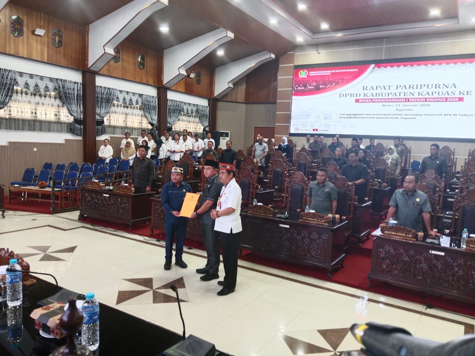 Dewan Perwakilan Rakyat Daerah (DPRD) Kabupaten Kapuas menggelar Sidang Paripurna masa persidangan I Tahun 2026 dengan agenda penyampaian rekomendasi terhadap Laporan Hasil Pemeriksaan (LHP) Badan Pemeriksa Keuangan Republik Indonesia (BPK RI) Tahun Anggaran 2025 kepada Pemerintah Kabupaten Kapuas diruang sidang utama DPRD Kabupaten Kapuas pada Rabu, 21/1/2026 .